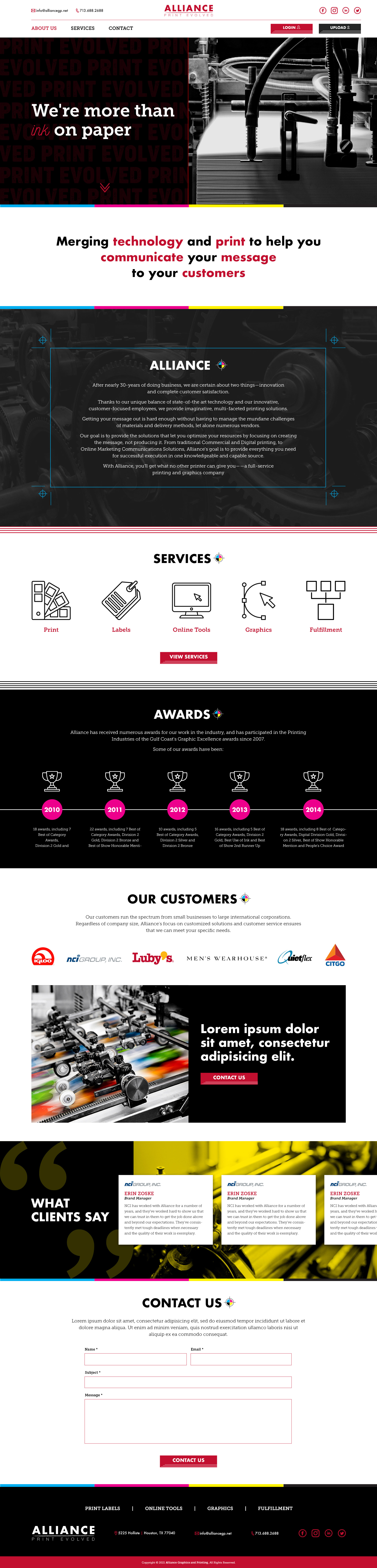 Website redesign and brand identity for Alliance, a printer company that has been in business for over 30 years. They offer offset and digital printing, and distribution services. The concept for this rebrand was to highlight some of the most important elements that represent and still make off-set printing unique, even nowadays. These include ink color, registration marks, paper, typography, machinery and equipment. I tried to incorporate those elements while simultaneously elevating the look and making it sophisticated without losing the crafting of printing. I designed this from concept to completion, from meeting with clients, brainstorming ideas, sketching, wireframing, prototyping, preparing files for development and testing the site for an optimal user experience.