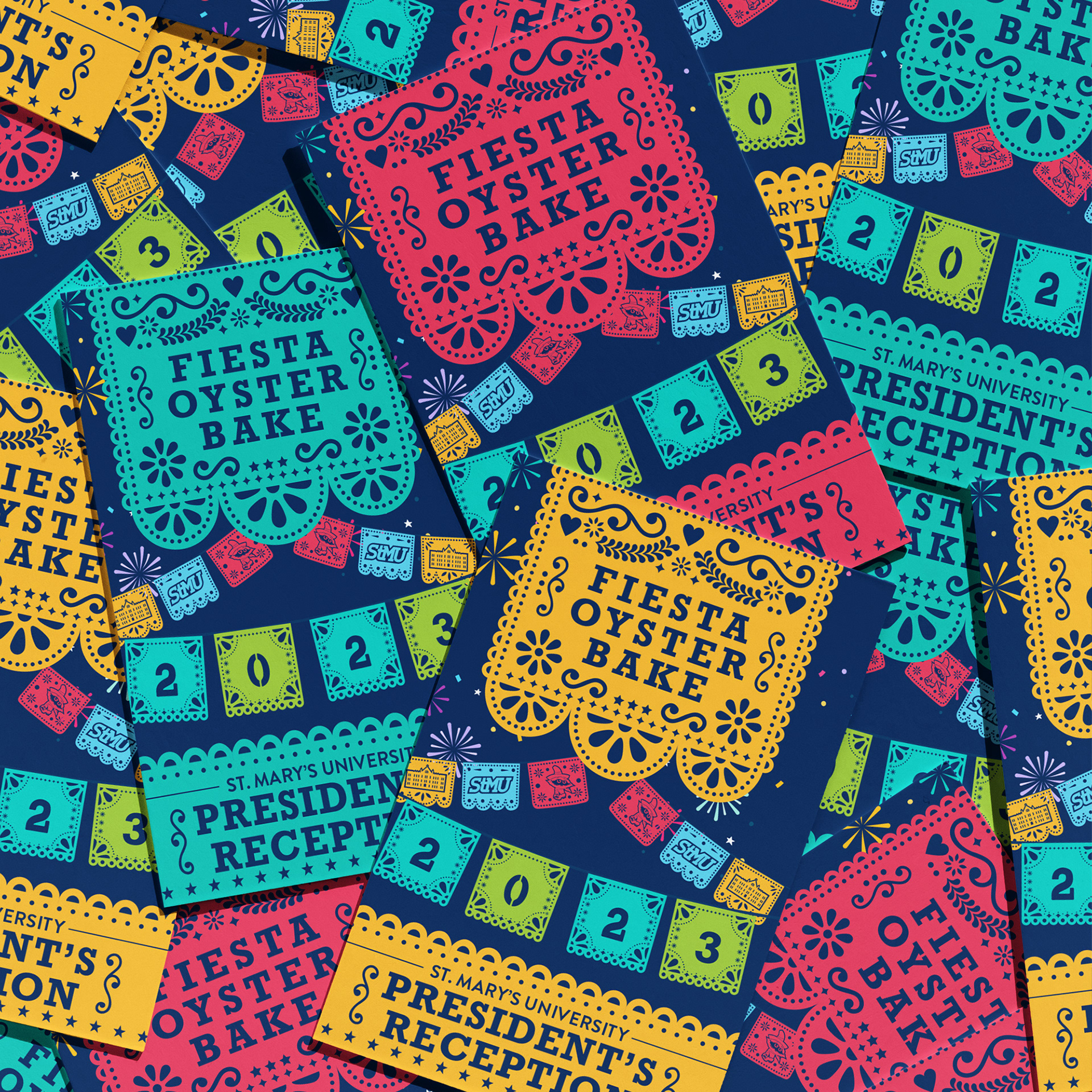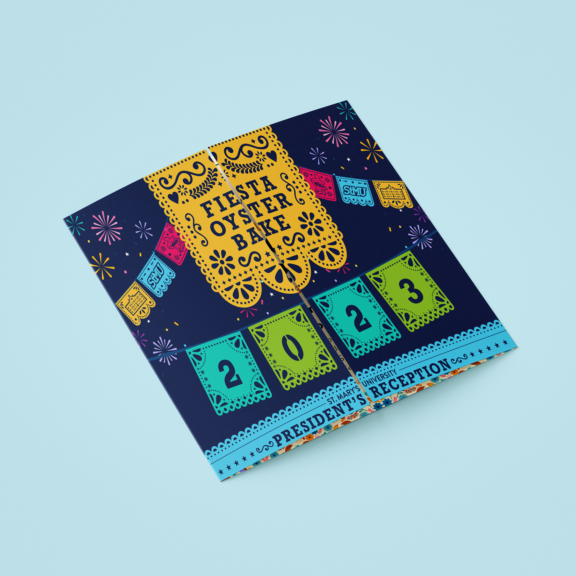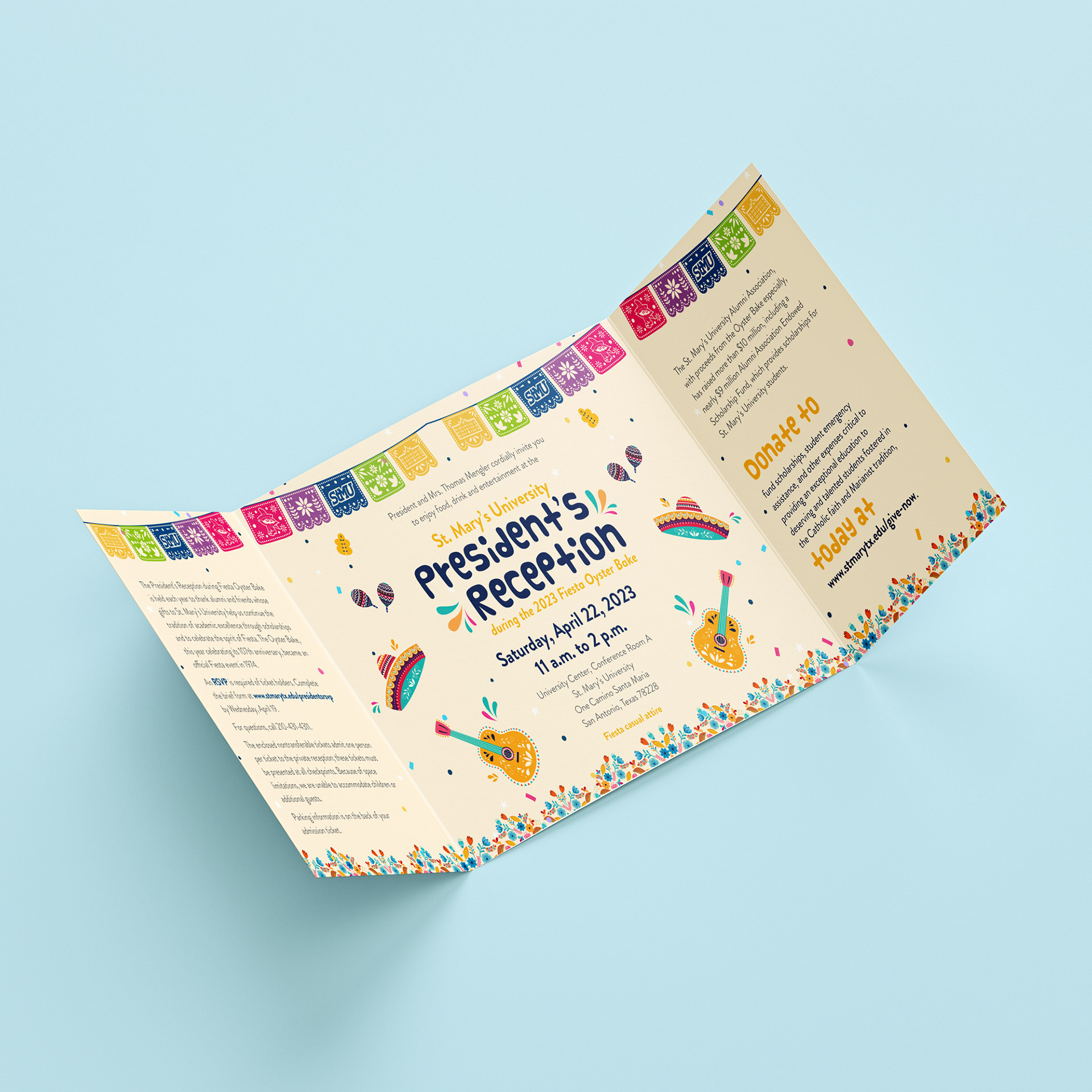 This invitation was created for the 2023 Fiesta Oyster Bake President’s Reception, a special event held annually during Fiesta Oyster Bake. The reception honors alums and friends whose generous contributions to St. Mary’s University support its commitment to academic excellence through scholarships while celebrating Fiesta’s vibrant spirit.