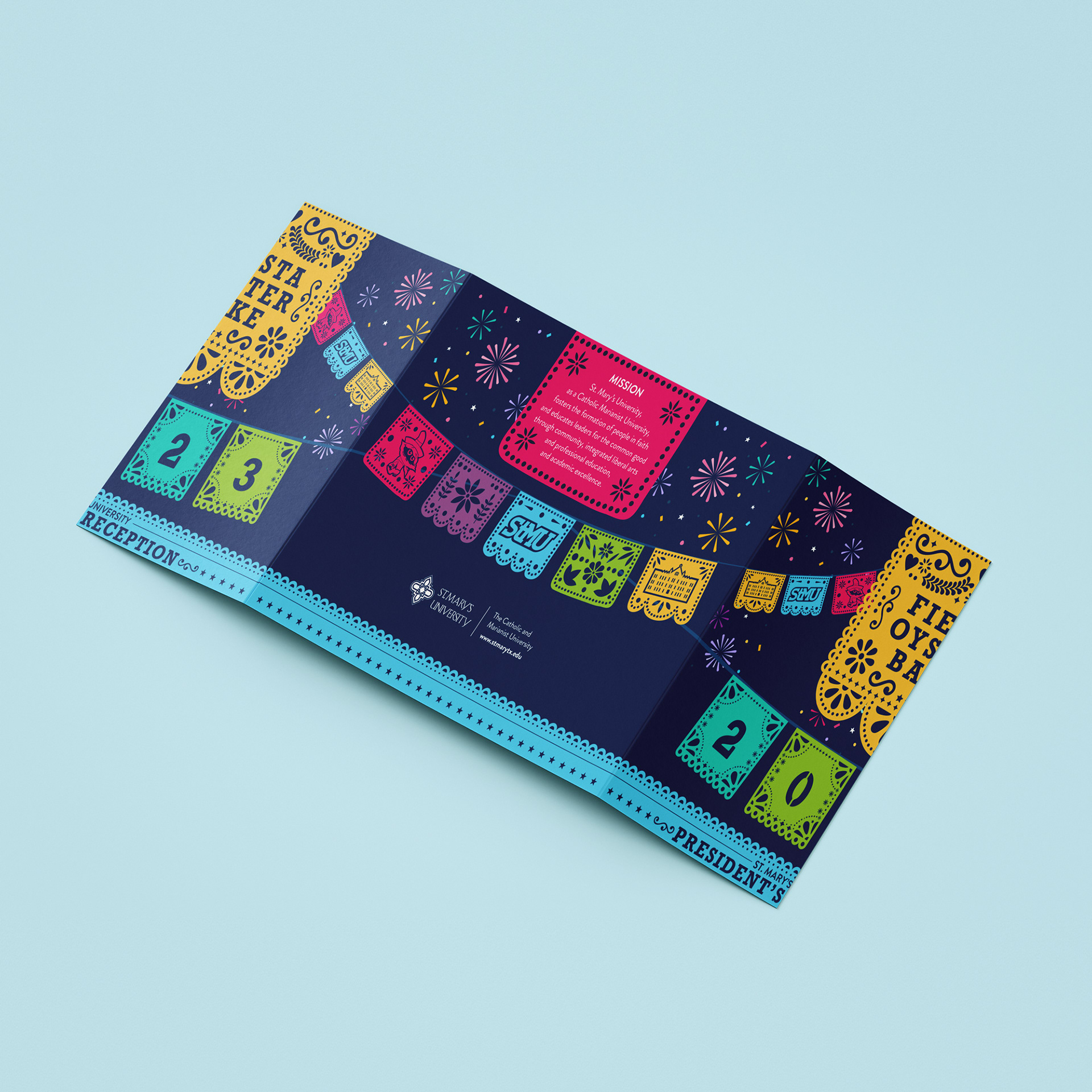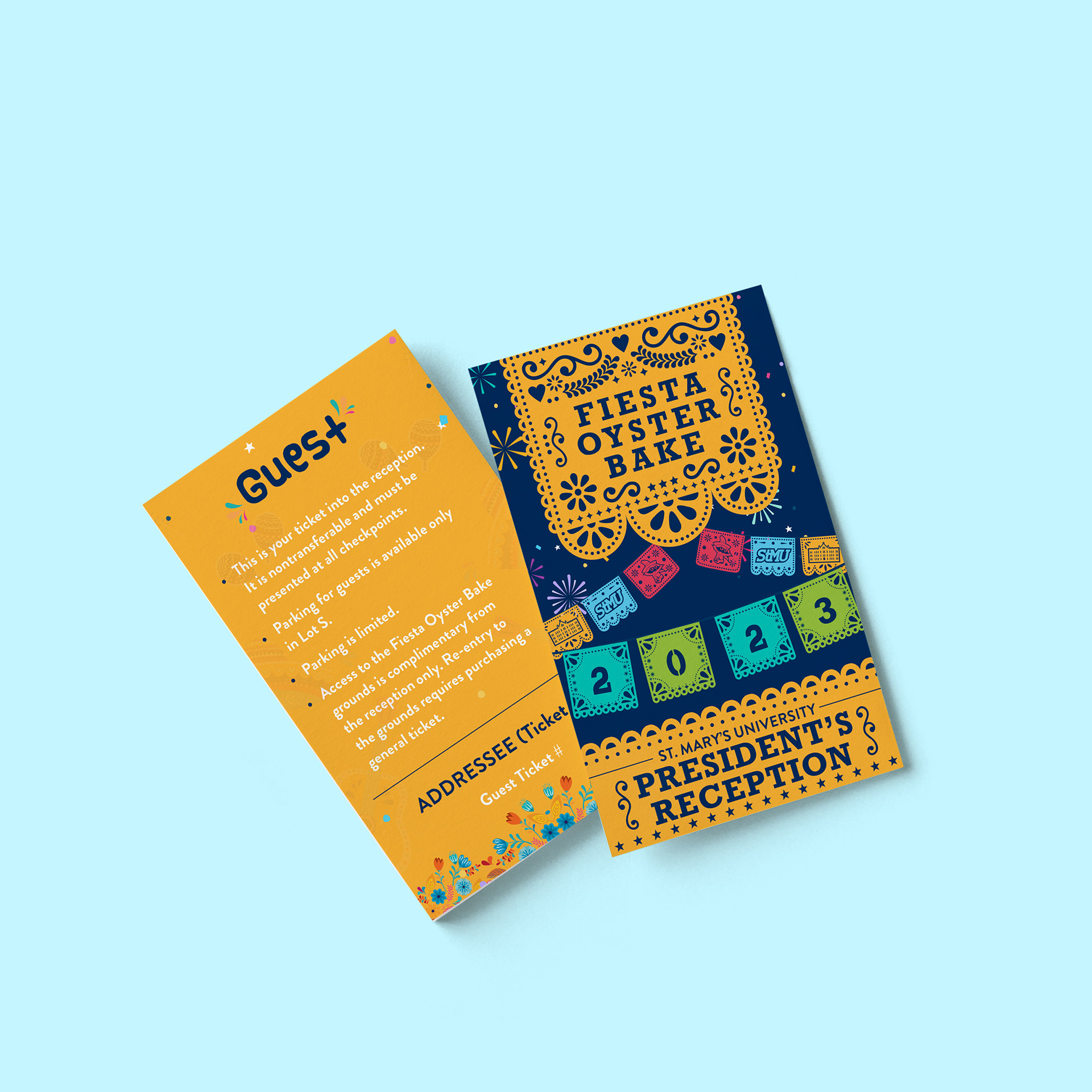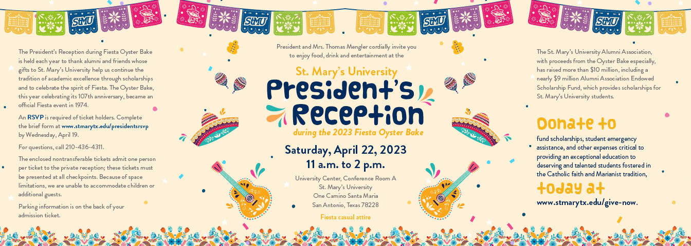 This invitation was created for the 2023 Fiesta Oyster Bake President’s Reception, a special event held annually during Fiesta Oyster Bake. The reception honors alums and friends whose generous contributions to St. Mary’s University support its commitment to academic excellence through scholarships while celebrating Fiesta’s vibrant spirit.