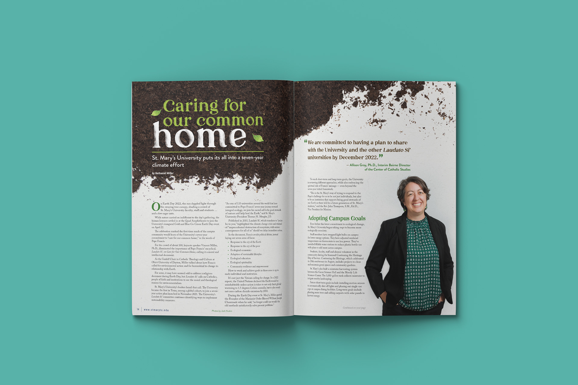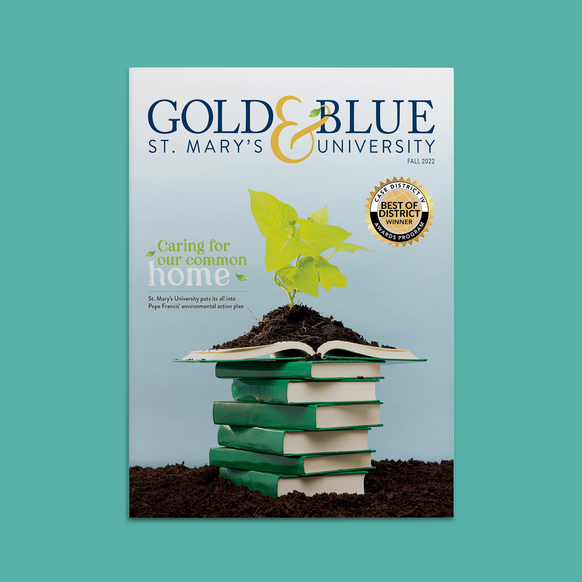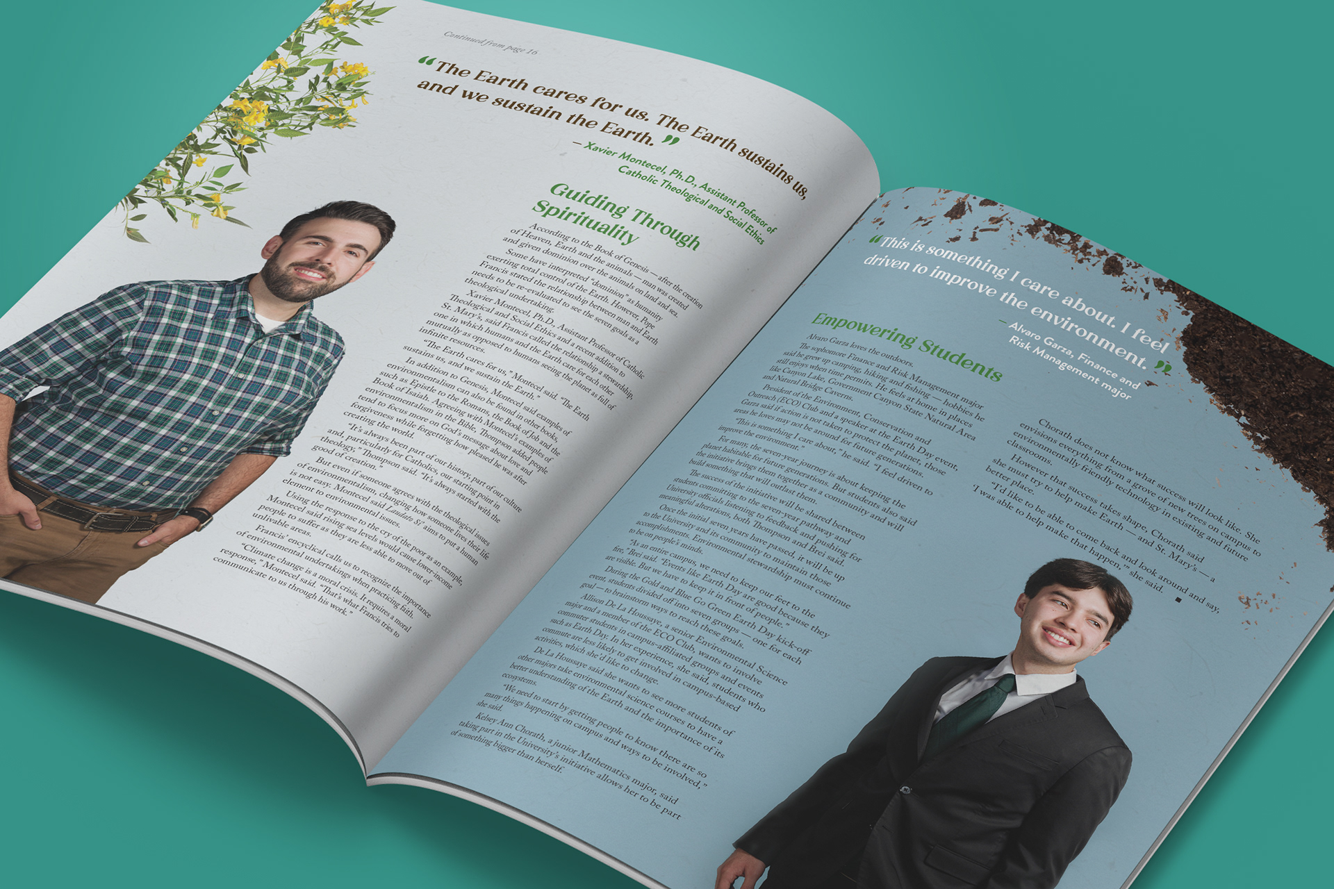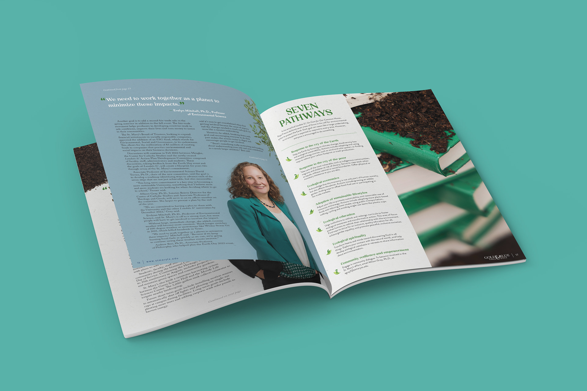 For our Gold & Blue Magazine Fall 2022 design, I developed a concept based on our school’s commitment to Pope Francis’s seven-year journey toward integral ecology. The idea behind the magazine cover was to have a stack of seven books with green covers and an open book at the top of the pile with a tiny sprout growing out of the soil to represent how education in those seven areas will transform our school and help fulfill our commitment to Pope Francis toward integral ecology. I integrated the concept throughout the magazine, particularly in the president's message section and the main cover story, utilizing imagery of plants, rich soil, and shades of blues, greens, and dark browns. This cohesive visual approach bridges the CV’s design with the cover story, conveying a sense of nature to the reader and emphasizing the importance of environmental stewardship.